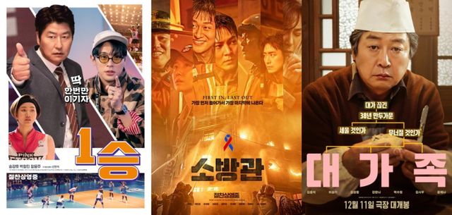 먼저 12월 둘째 주까지 개봉하는 1라운드는 ‘진정성’ 대결이다. 송강호·박정민 주연 여자배구 영화 ‘1승’과 곽도원·주원의 실화 기반 ‘소방관’이 지난 4일 포문을 열었다. 오는 11일에는 김윤석·이승기가 부자 호흡을 맞춘 가족코미디 ‘대가족’이 참전한다. 연말에 어울리는 진한 감동과 소소한 웃음으로 무장했다는 공통점이 있다.
