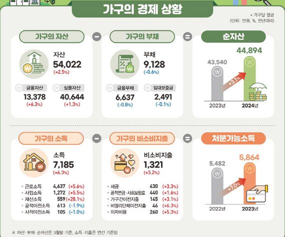 9일 통계청의 ‘2024년 가계금융복지조사 결과’에 따르면 올해 3월 말 기준 가구의 평균 자산은 5억 4022만원으로 지난해 대비 2.5% 늘어났다. 자산의 성격별로는 저축과 투자 등이 포함되는 금융자산이 6.3% 늘고, 부동산 등 실물자산은 1.3% 늘어났다. 자산에서 부채를 제외한 순자산은 4억 4894만원으로, 3.1% 증가했다.