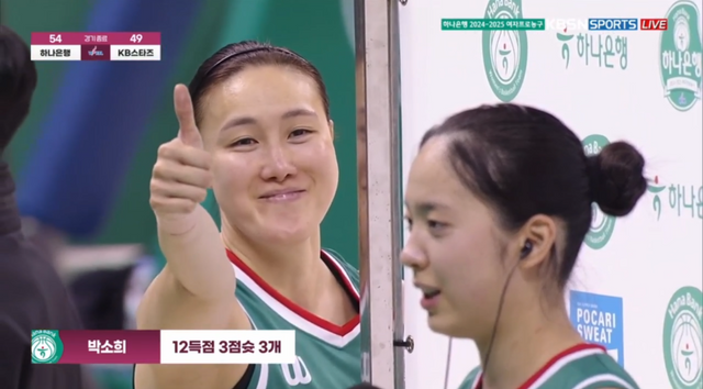 8일 하나은행 김정은(왼쪽)이 KB전 승리 뒤 방송사 수훈 선수 인터뷰를 진행 중인 박소희를 향해 엄지를 세워보이고 있다. 사진=KBS Sports 갈무리