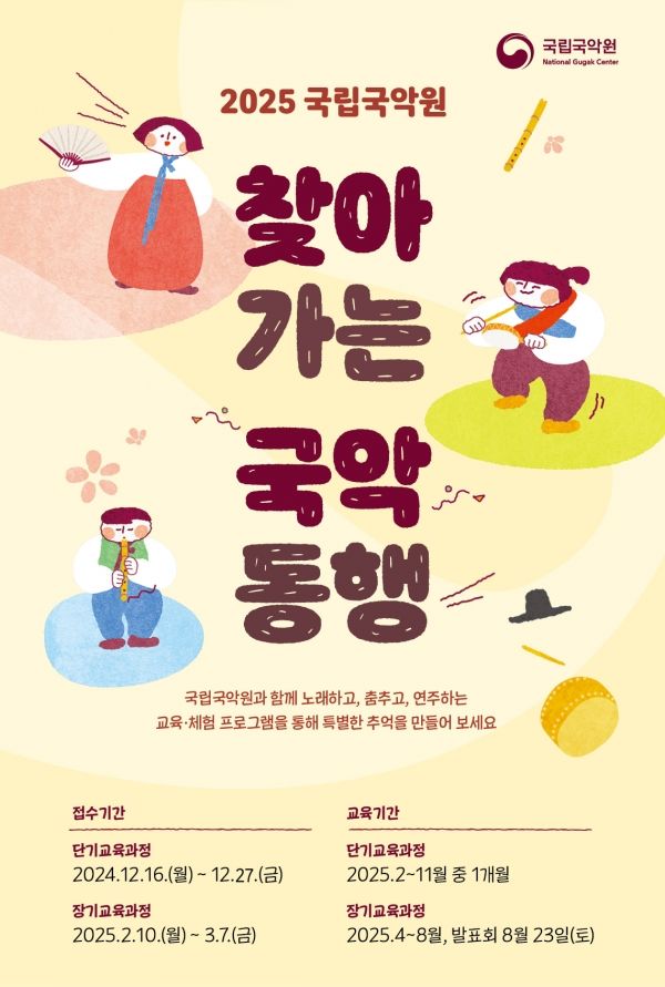 참가 대상은 아동(18세 미만) 대상 사회복지기관과 시설 등으로 회차당 10~25명이 참여할 수 있으며, 선정된 기관 내 희망 장소에서 진행한다. 단기교육과정은 12월 16일부터 27일까지, 장기교육과정은 2025년 2월 10일부터 3월 7일까지 e-국악아카데미 누리집에서 신청할 수 있다.