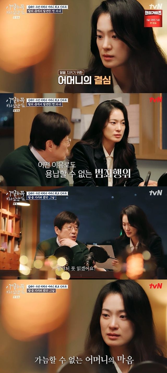 이어 옥자연은 “어머님의 의지가 워낙 강하셨다고 한다. 이 사건을 어떻게든 알려야 한다고”라고 덧붙이며 피해자 어머니의 심정을 대변했다. 이어 신체적, 정신적인 고통에 힘겨워하는 피해자 어머니를 지켜본 옥자연은 슬픔에 잠긴 모습으로 시청자들에게 공감을 안겼다.
