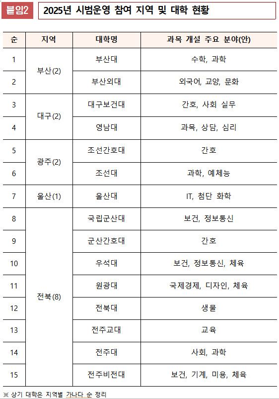 시범 운영에는 부산대, 영남대, 조선대, 울산대 등이 참여한다. 특히 전북 지역은 전북대, 전주교대, 국립군산대, 군산간호대, 원광대, 전주대, 전주비전대, 우석대 등 8개 대학이 참여해 가장 많은 수의 대학이 참여하는 지역이 됐다.