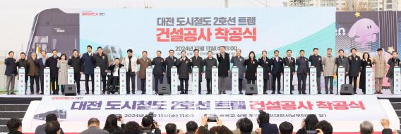 [대전=이데일리 박진환 기자] 대전의 최대 숙원사업인 도시철도 2호선 트램 건설이 마침내 시작된다. 대전시는 11일 유등교 상류 둔치에서 대전 트램 건설공사 착공식을 개최했다고 밝혔다. 착공식에는 1996년 정부의 기본계획 승인 이후 28년 만에 시작된 공사를 기념하기 위해 이장우 대전시장을 비롯해 조원휘 대전시의회 의장, 강희업 대도시권광역교통위원장 등 주요 내빈과 함께 시민 1000여 명이 참석했다.