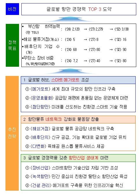 이에 정부는 글로벌 거점항만으로서의 부산항의 위상을 공고히하고 항만 경쟁력을 세계 TOP 3 수준으로 높이기 위하여 이번 방안을 마련하였다. 해양수산부는 부산항의 운영체계를 효율화하여 해운동맹 물량을 적기에 처리하도록 하고, 친환경‧스마트 전환을 가속화하여 국제규범을 선도하는 항만을 만들어 나갈 계획이다.