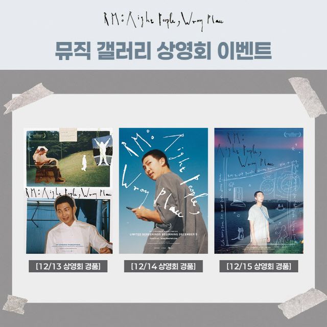 ‘알엠: 라이트 피플, 롱 플레이스’는 오는 13일(금)부터 15일(일)까지 3일 간 CGV용산아이파크몰에서 뮤직 갤러리 상영회를 연다. 뮤직 갤러리 상영회는 영화의 엔딩크레딧이 끝난 후, 영화의 깊은 여운을 느낄 수 있는 RM의 두 번째 솔로 앨범 ‘라이트 플레이스, 롱 퍼슨’의 수록곡 ‘넛츠’(Nuts), ‘헤븐’ 등 곡들과 함께 다채로운 스틸들을 감상할 수 있는 특별한 상영회이다. 그뿐만 아니라 특별상영회 관람 후 관람 당일 매표소에서 티켓 제시 시 각 날짜별로 상이한 디자인의 영화 A3 포스터를 관객 전원에게 증정한다.