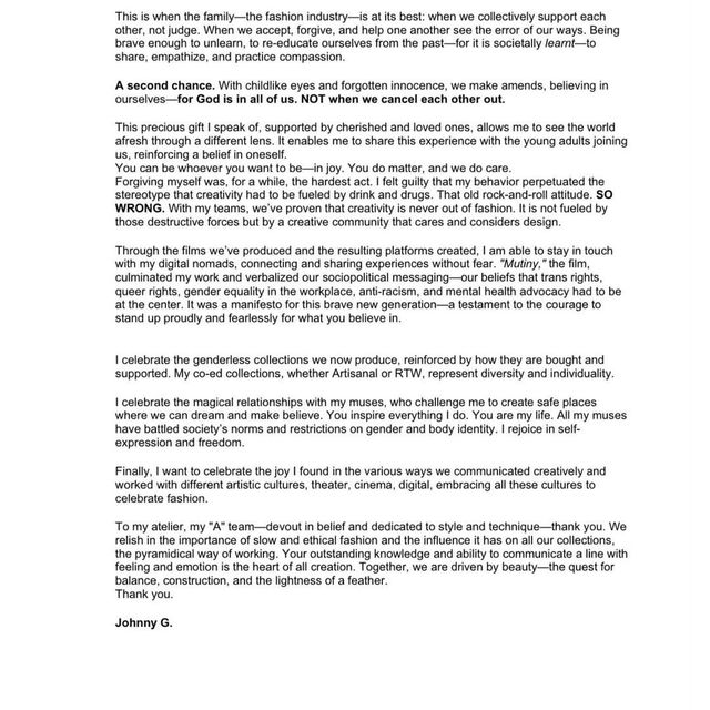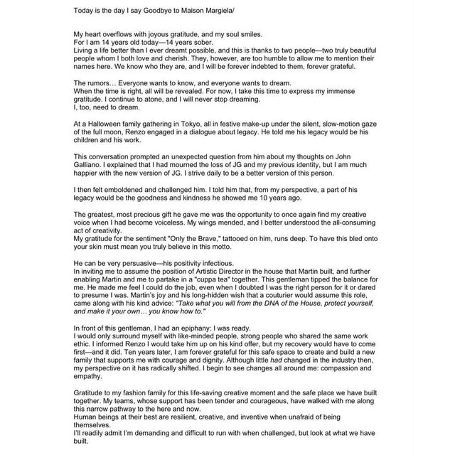 2014년 부임 후 10년 만에 메종 마르지엘라를 떠난 존 갈리아노. 모험을 즐기고 새로운 소재와 표현방식으로 무한한 상상력을 런웨이 피스들에 녹여냈던 그가 팀에 감사 인사와 함께 이별을 고했다. 다음 행보에 대해선 말을 아꼈지만, 그의 패션 여정은 계속될 예정! 마르지엘라에서 갈리아노의 뒤를 이어갈 인물은 아직 정해지지 않았다.