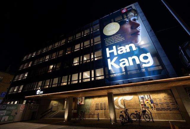 지난 11일(현지 시각) 스웨덴 스톡홀름의 '나투루 오크 쿨투르' 출판사에 걸린 한강 작가의 대형 현수막. / 연합뉴스