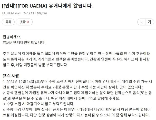 이날 소속사는 "추운 날씨에도 아이유 응원봉을 들고 집회에 참석해 주는 팬들을 격려하기 위해 각종 먹거리와 핫팩을 준비했다"라며 "빵 200개, 음료 200잔, 떡 100개, 국밥 200그릇을 준비했다"라고 밝혔다.