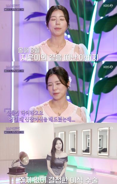 이어 양지은은 "그때 아빠를 살려야겠다는 생각밖에 없었다. 몇주 후 빠른 시일 내에 수술을 하게 됐다"고 덧붙였다.