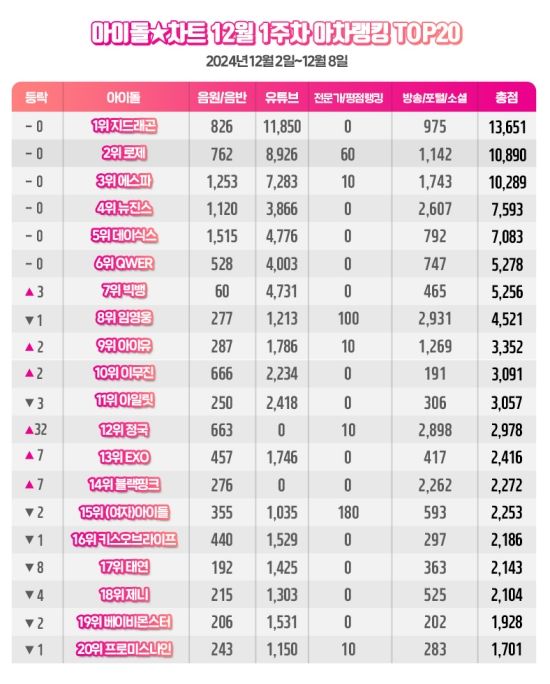 이번 12월 1주차 아차랭킹 2위는 총점 10,890점을 획득한 로제가 차지했고, 이어 에스파(10,289점), 뉴진스(7,593점), 데이식스(7,083점), QWER(5,278점), 빅뱅(5,256점), 임영웅(4,521점), 아이유(3,352점), 이무진(3,091점) 순으로 집계됐다.