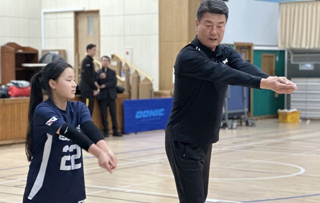 동여자중학교 학생과 국군체육부대 배구단 박상용 감독.
