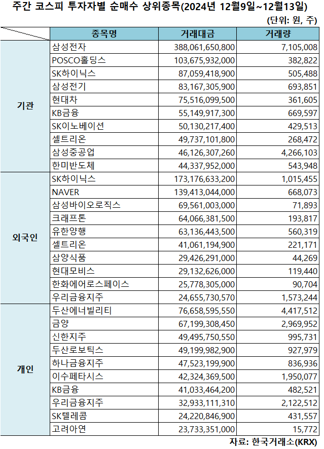 기관 '삼성전자'·외인 'SK하이닉스'·개인 '두산에너빌리티' 1위 [주간 코스피 순매수- 12월9일~12월13일]
