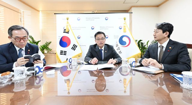 (서울=연합뉴스) 최상목 경제부총리 겸 기획재정부 장관이 15일 오후 서울 종로구 정부서울청사에서 열린 에서 발언하고 있다. 왼쪽부터 조태열 외교부 장관, 최상목 부총리, 안덕근 산업통상자원부 장관. 2024.12.15 [기획재정부 제공. 재판매 및 DB 금지]