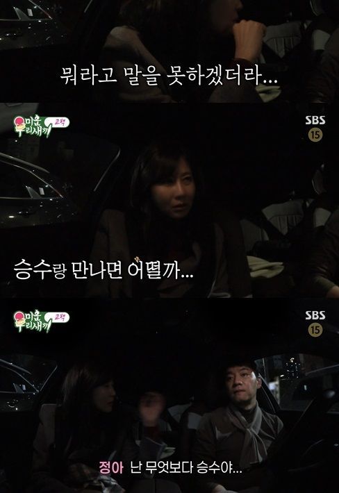 양정아는 이에 놀라며 답을 망설이더니 "너무 어지럽고 너무 심장이 뛰어서 너한테 뭐라고 말을 못 하겠더라"라며 "나도 너무 생각 많이 했다. '승수랑 만나면 어떨까'라고. 무엇보다 승수야, 우리가 나이도 있고 인연을 만나게 되면 특히 너는 이제 결혼으로 가야 한다"라고 조언했다.