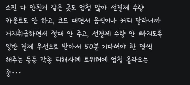 국민신문고에 여의도 일대 선결제된 매장들 저런경우 많았어서 선결제주문 소진다된 거 맞는지 확인해달라고 민원 들어가는 중. 선결제된 건 안주고 현장결제하는 사람들 먼저 줄스라는 매장들 많았다고 함