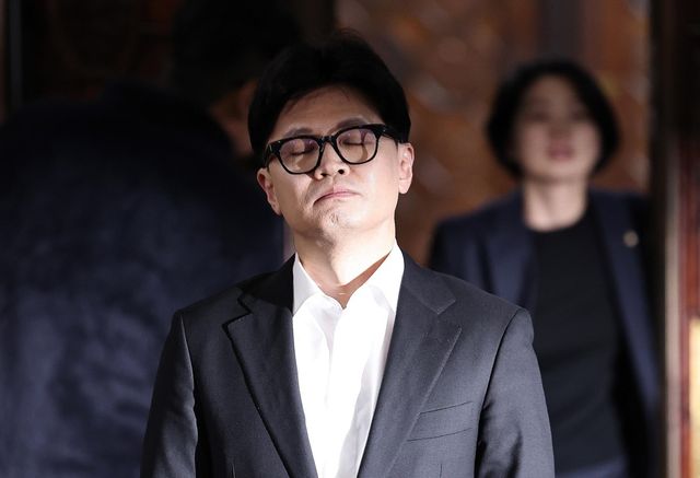 한동훈 국민의힘 대표가 14일 오전 서울 여의도 국회에서 윤석열 대통령에 대한 탄핵소추안 가결 관련 입장을 밝히기 전 생각에 잠겨 있다. / 뉴스1