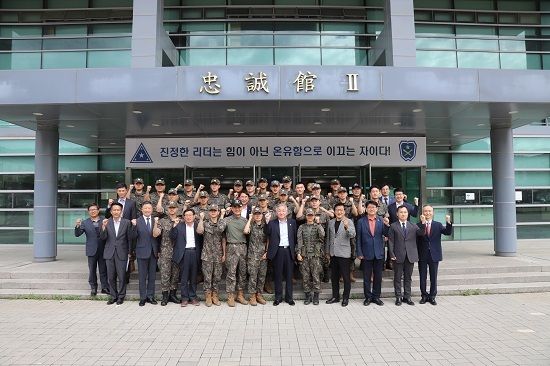청주대학교 학군단이 2024 육군본부 우수학군단 선발심의에서 1위를 차지해 김윤배 총장이 학군단 관계자들을 찾아 격려하고 기념사진을 찍고 있다. / 청주대학교