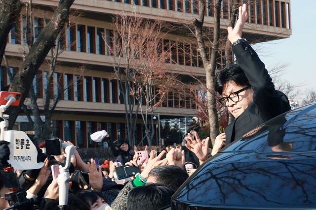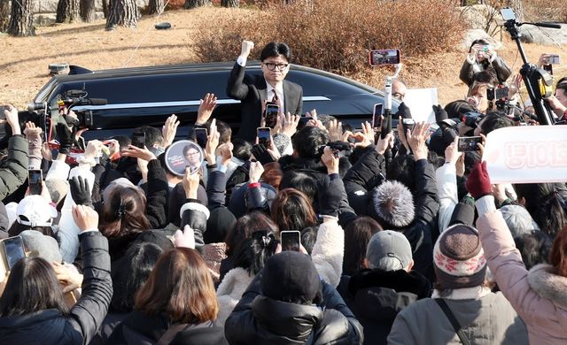 국회 본청 앞에는 한 전 대표의 팬카페인 '위드후니' 회원들이 나와 마지막 순간을 함께 했다. 이들은 '한동훈'을 연호하며 "한동훈을 지키겠다"라고 외쳤다. 일부 지지자는 눈물을 보이기도 했다.