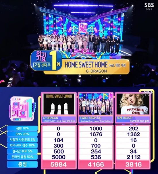 지난 15일 지드래곤은 SBS '인기가요'에서 1위를 차지했다. 트와이스 '스트래티지(Strategy)', 블랙핑크 로제 '넘버원 걸(number one girl)' 등 쟁쟁한 후보들과의 접전 끝 지드래곤은 '홈 스윗 홈(HOME SWEET HOME)'으로 온라인 음원 점수에서 두각을 드러내며 5984점으로 1위를 차지했다.