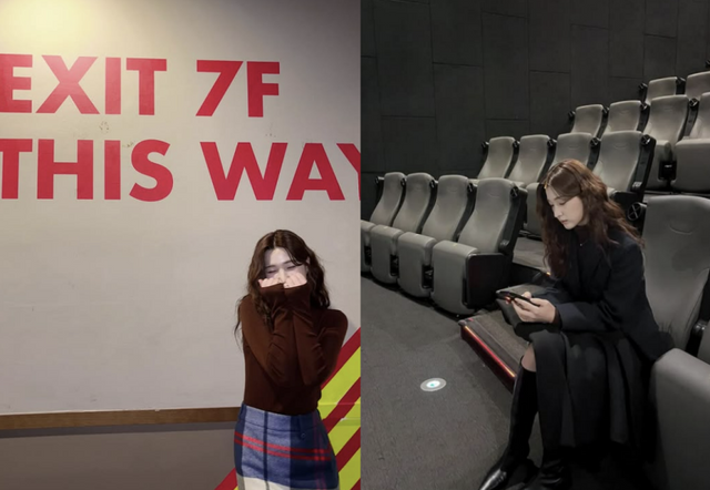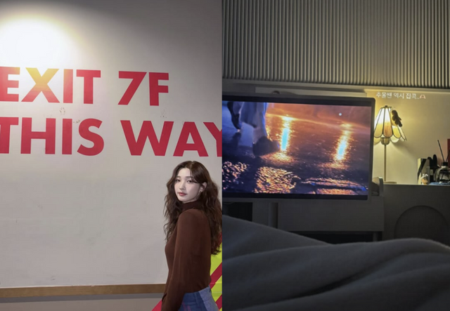이날 앞서 별다른 멘트 없이 게시한 사진에서는 영화관을 방문한 듯 빈 객석에 앉아있는 모습과 ‘EXIT 7F THIS WAY’(7층 출구는 이쪽)이라고 적힌 문구 아래서 포즈를 취했다.