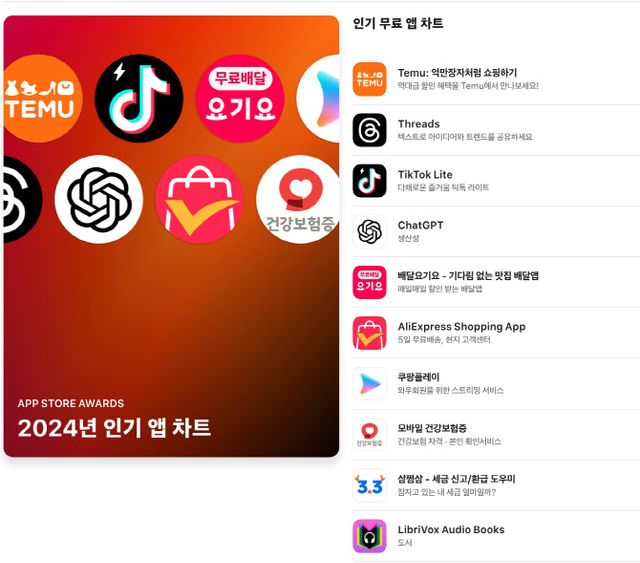 인기 무료 앱 차트 1위에는 테무가 올랐고, 이어 메타가 만든 새로운 소셜네트워크서비스(SNS) 스레드, 리워드형 플랫폼 ‘틱톡 라이트’, 인공지능(AI) 챗봇 서비스 챗GPT, 배달 앱 ‘요기요’가 상위 5위에 이름을 올렸다. 이어 알리익스프레스, 쿠팡플레이, 모바일 건강보험증, 삼쩜삼, 라이브리복스 오디오 북스가 순으로 6위부터 10위를 차지했다.