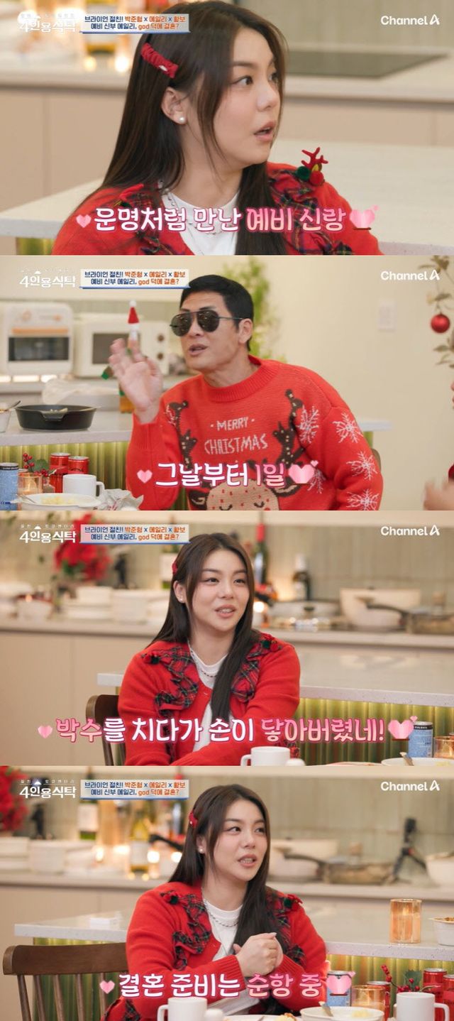 박준형은 “그날 사귀게 됐다고 하더라”고 말했고 에일리는 “공연장이 추웠다. 벌벌 떨고 있는데 재킷을 주더라 무릎에 덮으라고. 그쪽도 옷을 얇게 입어서 같이 덮자고 했다. 박수를 치다가 손이 닿았다”고 연인이 된 계기를 설명했다.