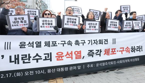 윤석열즉각퇴진·사회대개혁 비상행동은 17일 서울 용산구 한남동 대통령 관저 앞에서 기자회견을 열고 “아직도 내란수괴인 윤석열에 대한 신병확보가 이뤄지지 않고 있다”면서 “공조수사본부는 신속히 윤석열을 체포·구속해야 한다”고 강조했다. 그러면서 대통령실과 관저에 대한 압수수색도 진행해야 한다고 했다.