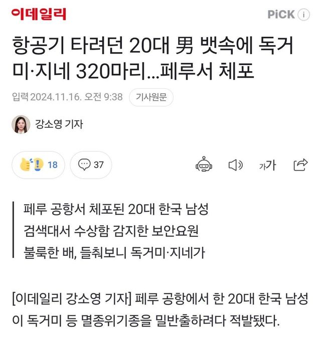 • 페루 공항에서 한국인 남성이 타란툴라 320마리, 지네 110마리, 총알개미 9마리를 숨겨 출국하려다 적발됐다.