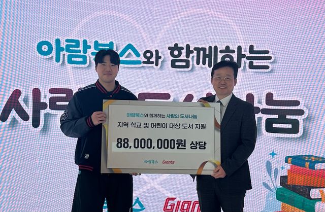 (엑스포츠뉴스 유준상 기자) 롯데 자이언츠가 지난 10일 아람북스와 '사랑의 도서나눔' 사회공헌 전달식을 진행했다. 이날 전달식에는 이석형 아람북스 마케팅 본부장과 포수 손성빈이 참석했다.