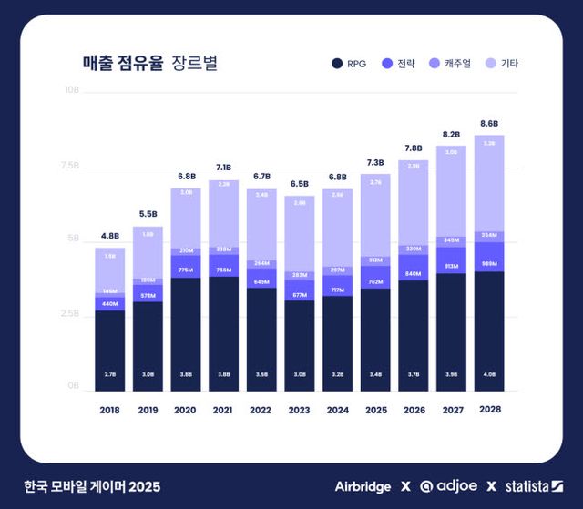 장르별 매출 점유율은 RPG가 압도적 우위를 보였다. RPG는 약 31억 7천만 달러로 전체 시장 매출의 47%를 차지했으며, 매출의 80~90%는 인앱 구매에서 발생하는 것으로 분석됐다. 이외 전략 게임은 7억 1,660만 달러, 캐주얼 게임은 2억 9,670만 달러의 매출을 기록했다.