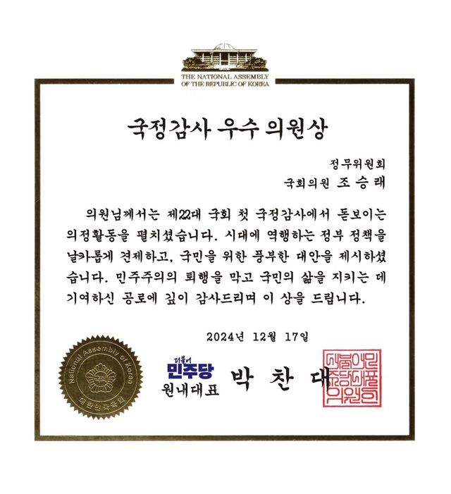 조승래 더불어민주당 의원(대전 유성구갑)이 제22대 국회 첫 국정감사에서 더불어민주당 우수의원으로 선정됐다.이로인해 조 의원은8년 연속으로 당 국정감사 우수의원 상을 수상하게 됐다.