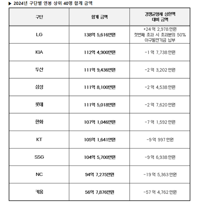 한구야구위원회(KBO)는 18일 2024년 구단별 연봉 상위 40명의 합계 금액을 발표했다.