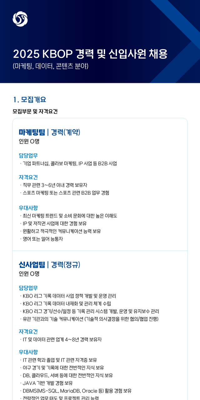 (엑스포츠뉴스 유준상 기자) 한국야구위원회(KBO)와 KBOP(KBO 마케팅 자회사)가 18일부터 공개 채용을 실시한다.