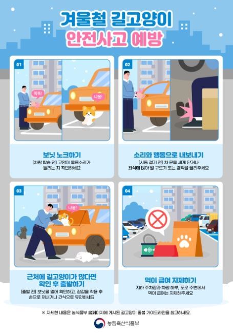농식품부 박정훈 동물복지환경정책관은 “차량 시동 전 노크 등 확인은 생명사랑의 실천과 동시에 운전자의 생명과 재산을 지키기 위한 최소한의 노력”이라고 강조하며, “평소에 주차장, 차량 하부 등 위험한 장소에서 먹이 주기를 자제하는 등 올바른 길고양이 돌봄 실천”을 함께 당부했다.