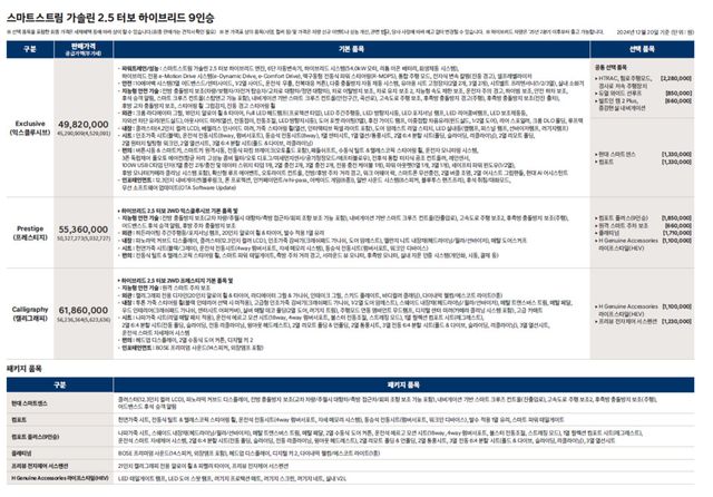 신형 팰리세이드 2.5 터보 하이브리드 모델 9인승 모델 가격은 9인승 익스클루시브 4,982만 원, 프레스티지 5,536만 원, 캘리그래피 6,186만 원부터 시작한다.