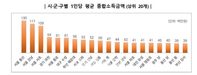 특히 국세청은 이번에 처음으로 229개 시·군·구별로 1인당 평균 종합소득금액 통계냈다. 1인당 평균 종합소득금액이 가장 높은 지역은 서울 용산구로 1억3000만원에 달했다. 이어 서울 강남구 1억 1700만원, 서초구 1억 900만원 순이다.