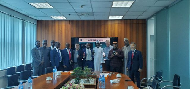 ▲ ▲나이지리아 중요 인사들이 ㈜맥스젠테크놀로지에서 개발한 나이지리아 자국산 스마트폰을 들고 기념 촬영하고 있다.(왼쪽에서 여섯 번 째가 김영수 대표)