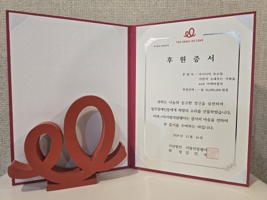 사랑의달팽이는 최근 다이나믹듀오, 관객 '가끔씩 오래 보는 사람들', 소속사 아메바컬쳐가 청각장애 아동 지원을 위해 3,000만 원을 기부했다고 밝혔다.