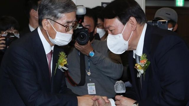 2021년 11월 당시 국민의힘 윤석열 대선 후보가 서울 중구 한국프레스센터에서 열린 신평 변호사 출판기념회에 참석, 신 변호사와 악수하는 모습 / 연합뉴스