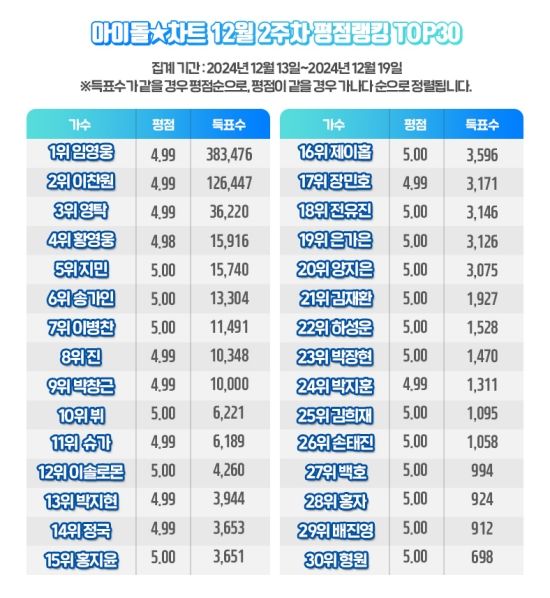 아이돌차트에 따르면, 지난 12월 13일부터 12월 19일까지 집계된 평점랭킹에서 임영웅은 38만 3,476표를 얻어 1위에 올랐다.