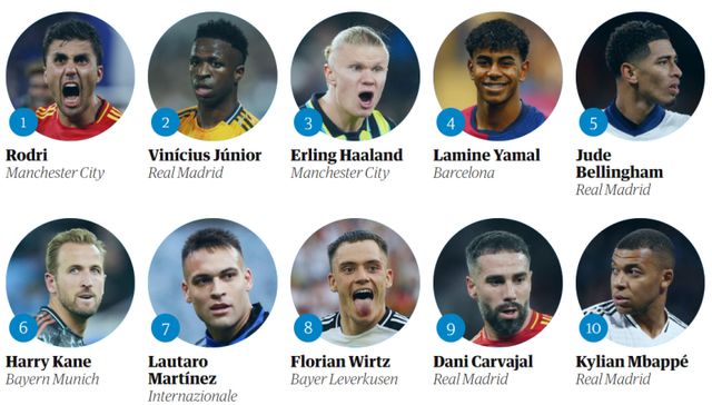가디언이 선정한 2024년 세계 최고의 선수는 2024 발롱도르 수상자인 로드리(맨체스터 시티)가 선정됐다. 지난해 5위였던 로드리는 4계단 순위를 끌어올려 처음으로 1위에 이름을 올렸다. 비니시우스 주니오르(레알 마드리드), 엘링 홀란(맨체스터 시티), 라민 야말(바르셀로나), 주드 벨링엄(레알 마드리드)이 로드리의 뒤를 이었다.