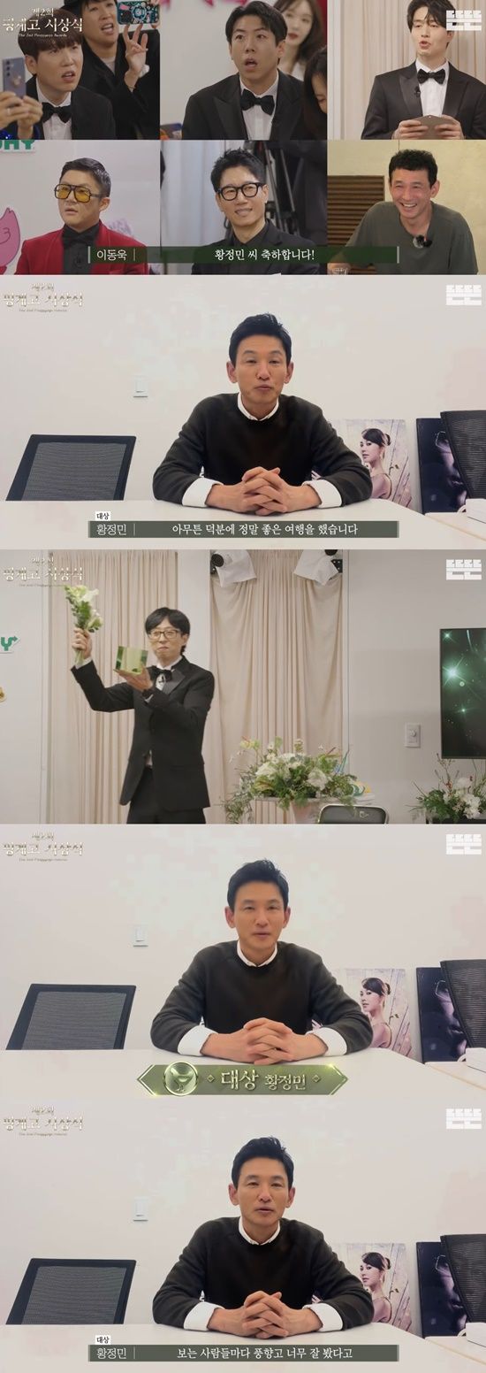 황정민은 "제가 대상을 받았다. 여러분들이 한 표 한 표 찍어주셔서 대상을 받았다. 정말 감사하다. 덕분에 정말 좋은 여행을 했다"며 "석진이 형을 필두고 재석, 세찬씨와 행복하게 다녀왔다. 여러분들이 너무 사랑해주셔서 다들 풍향고 너무 잘 봤다고 하더라. 기분이 너무 좋았다"고 감사 인사를 전했다.