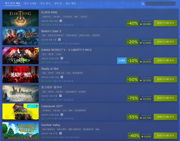 할인을 진행 중인 게임 가운데 가장 큰 인기를 끌고 있는 게임은 프롬 소프트웨어 최고 인기작 ‘엘든 링’과 지난해 최고의 명작 RPG로 맹활약했던 라리안 스튜디오의 ‘발더스 게이트3’다. 각각은 40%, 20% 할인된 가격을 제공 중이며, 22일 스팀 전세계 최고 인기 게임 4위, 5위로 높은 판매량을 올리고 있다.