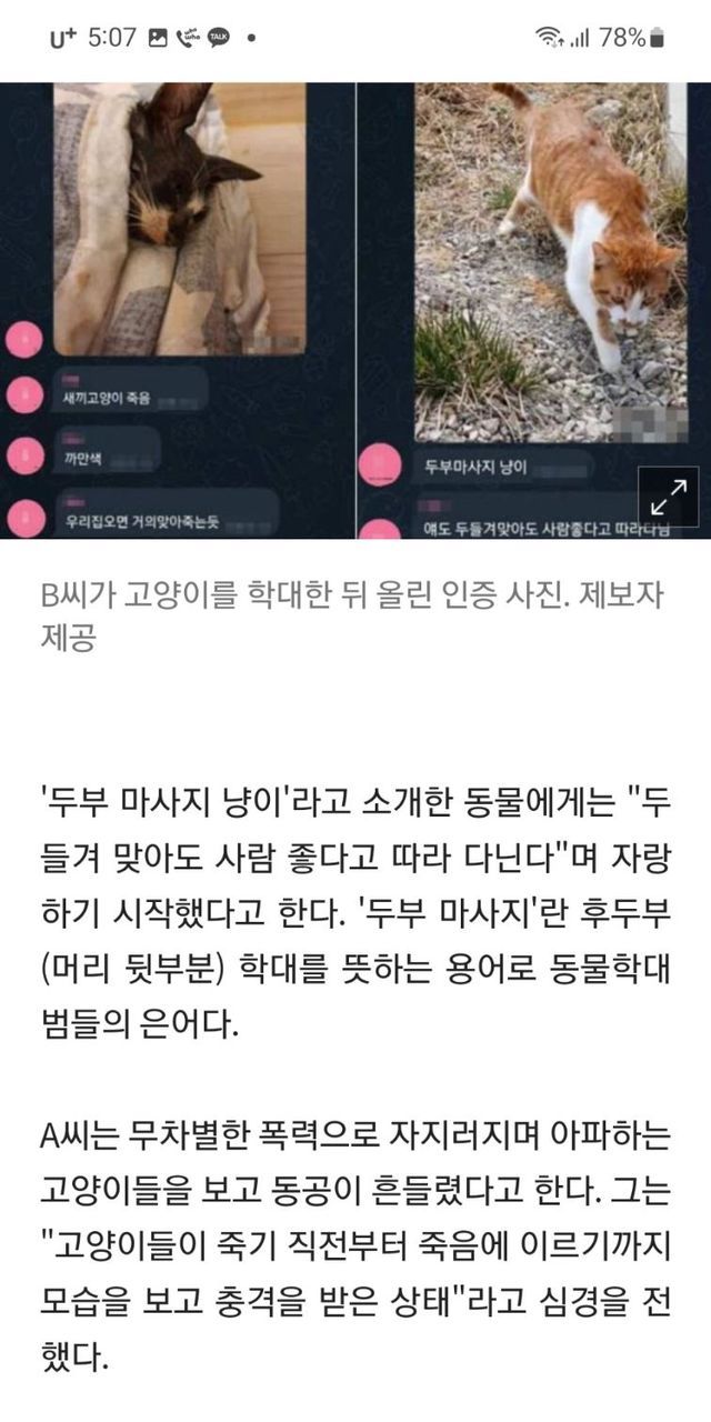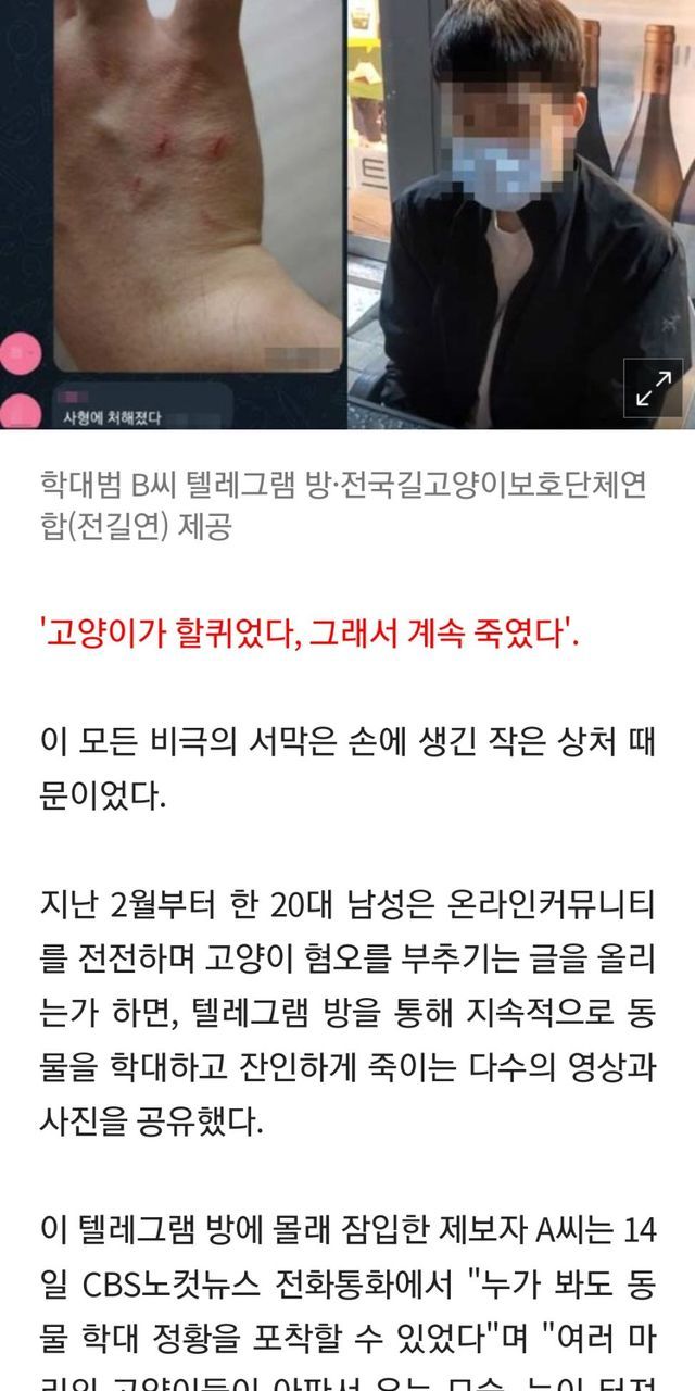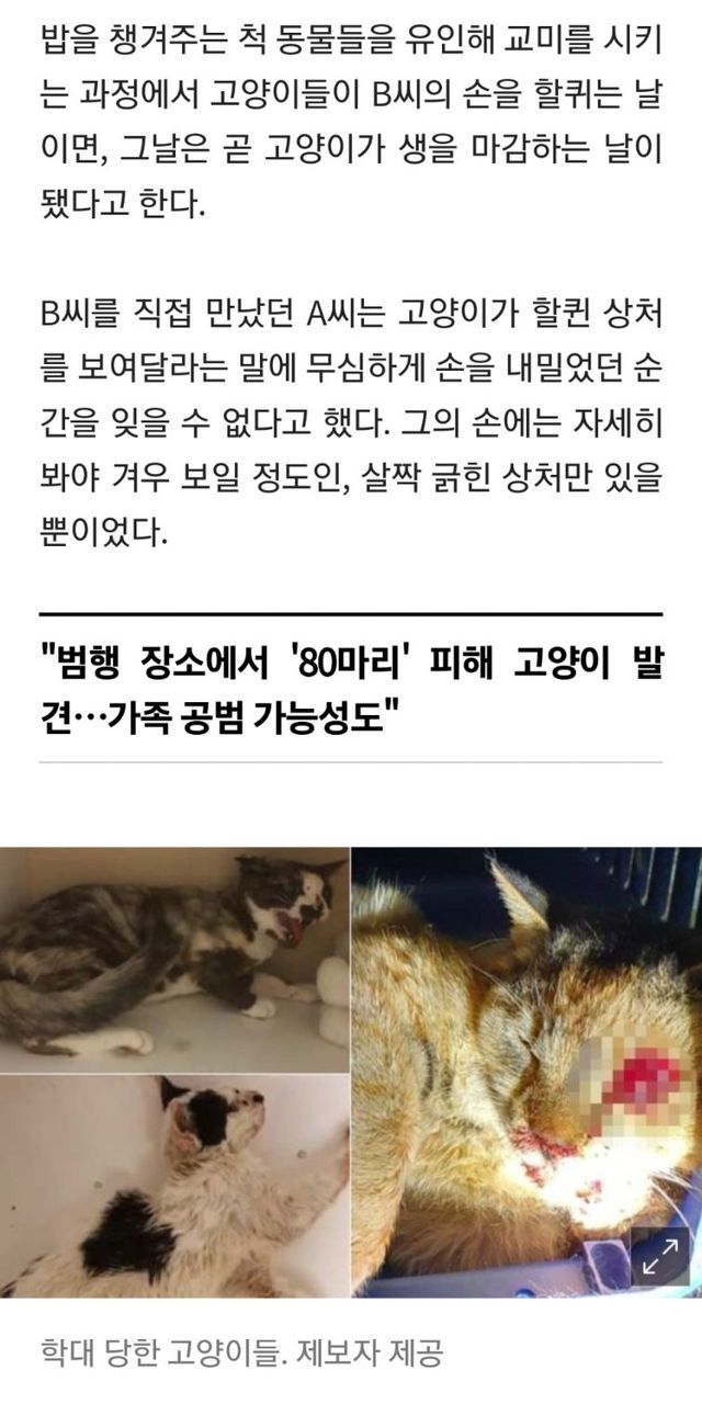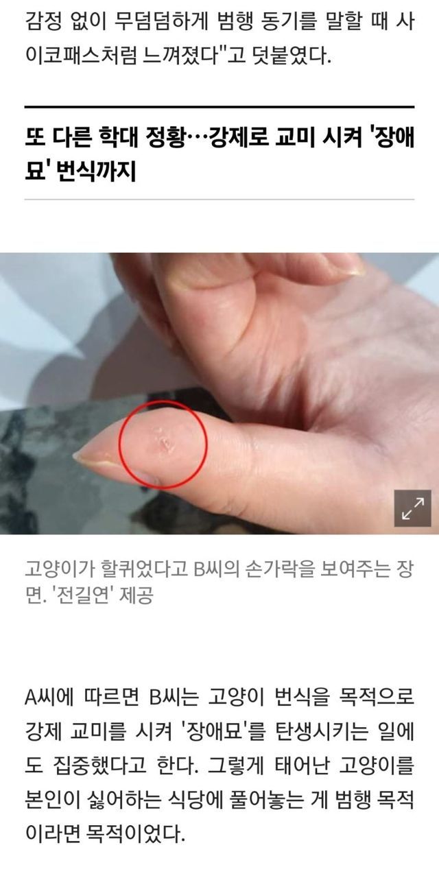 C씨는 “(B씨가) 특별한 이유 없이 고양이를 만지다가 살짝 할퀸 상처로 이 모든 범행을 시작한 것”이라며 “가학적인 행동을 했음에도 아무 감정 없이 무덤덤하게 범행 동기를 말할 때 사이코패스처럼 느껴졌다”고 덧붙였다.