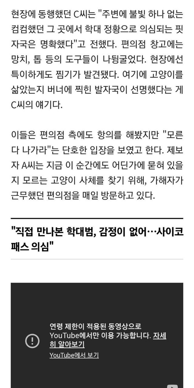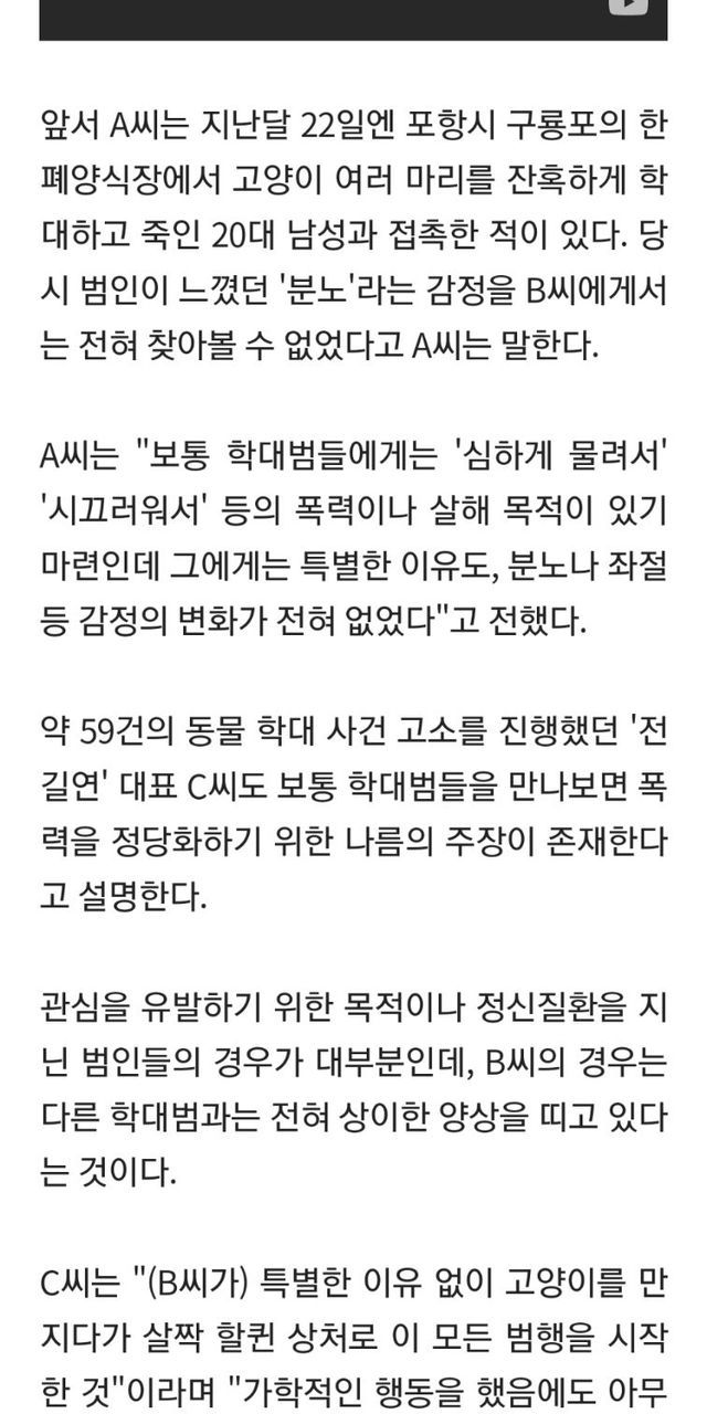 앞서 A씨는 지난달 22일엔 포항시 구룡포의 한 폐양식장에서 고양이 여러 마리를 잔혹하게 학대하고 죽인 20대 남성과 접촉한 적이 있다. 당시 범인이 느꼈던 ‘분노’라는 감정을 B씨에게서는 전혀 찾아볼 수 없었다고 A씨는 말한다.