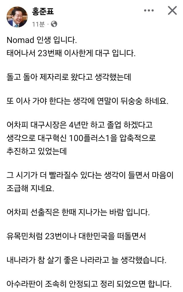 홍 시장은 이날 자신의 페이스북 글에서 "Nomad(유목민)인생이다. 태어나서 23번째 이사한 것이 대구"라면서 이같이 말했다.