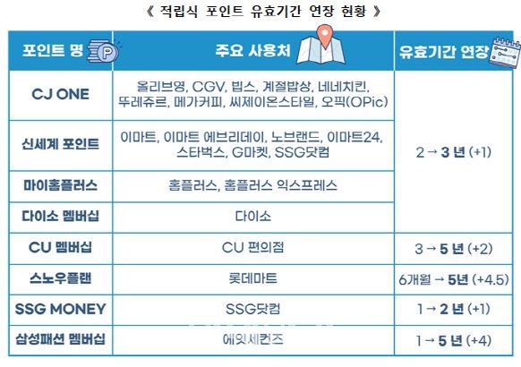 포인트 유효기간 연장은 각 기업 사정에 따라 단계적으로 적용된다. SSG닷컴은 올해 안에 적용을 시작하고, CU 편의점은 내년 7월 적립 포인트부터 적용할 방침이다. 그 외 사업자는 시스템 구축 등에 필요한 기간을 고려해 2026년 적립·발생 포인트부터 적용을 시작할 예정이다.
