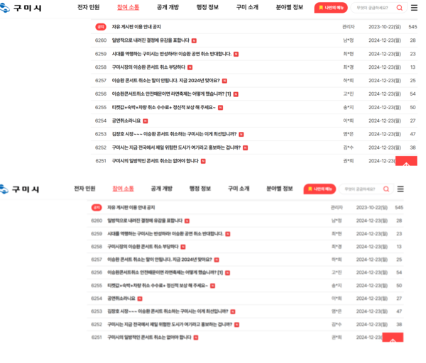 23일 오전, 구미시 온라인 홈페이지 자유게시판에는 '이승환 콘서트의 일방적인 취소를 반대한다'는 글 수십 건이 올라오고 있다.