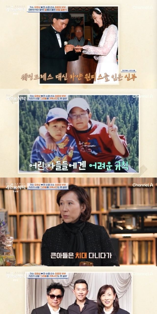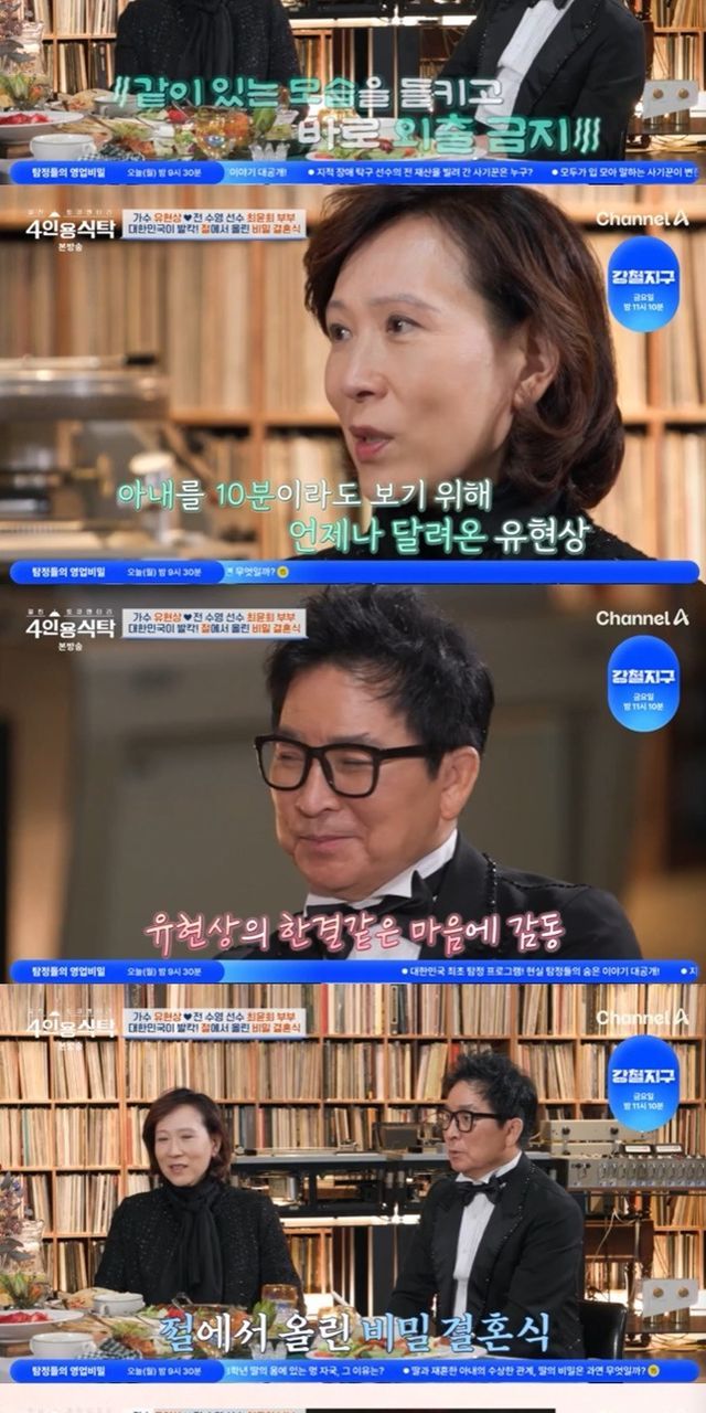 23일 방송한 채널A ‘절친 토큐멘터리 – 4인용식탁’에서는 결혼 34년 차 1세대 헤비메탈 그룹 백두산 리더 가수 유현상과 아시안게임 5관왕 신화를 쓴 전 수영선수 최윤희 부부가 출연했다.