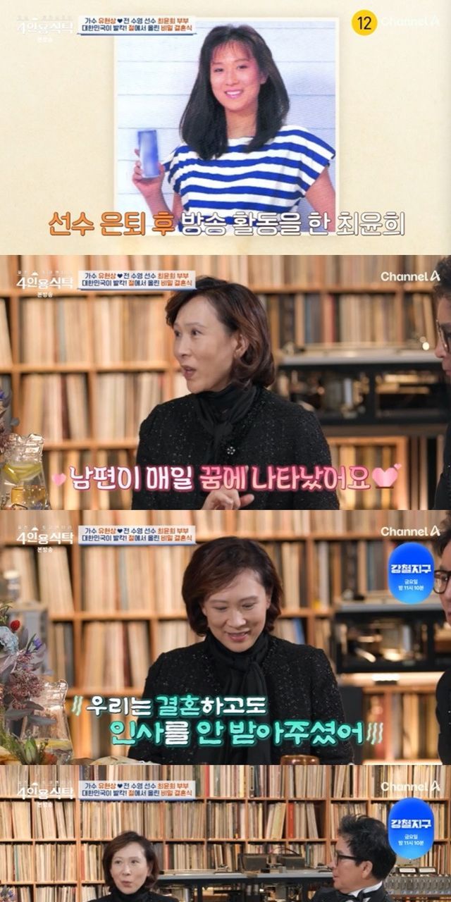 최윤희는 "은퇴 후 방송 일을 했다. KBS 방송국 계단에서 만났다. 예전에는 MBC와 KBS밖에 없었다. MBC에서 방송 일을 하고 KBS 오면 그 많은 사람 중에 유달리 남편과 자주 마주쳤다. 그 후에 사석에서 봤는데 낯도 익어서 금방 친해졌다"라며 첫 만남을 회상했다.